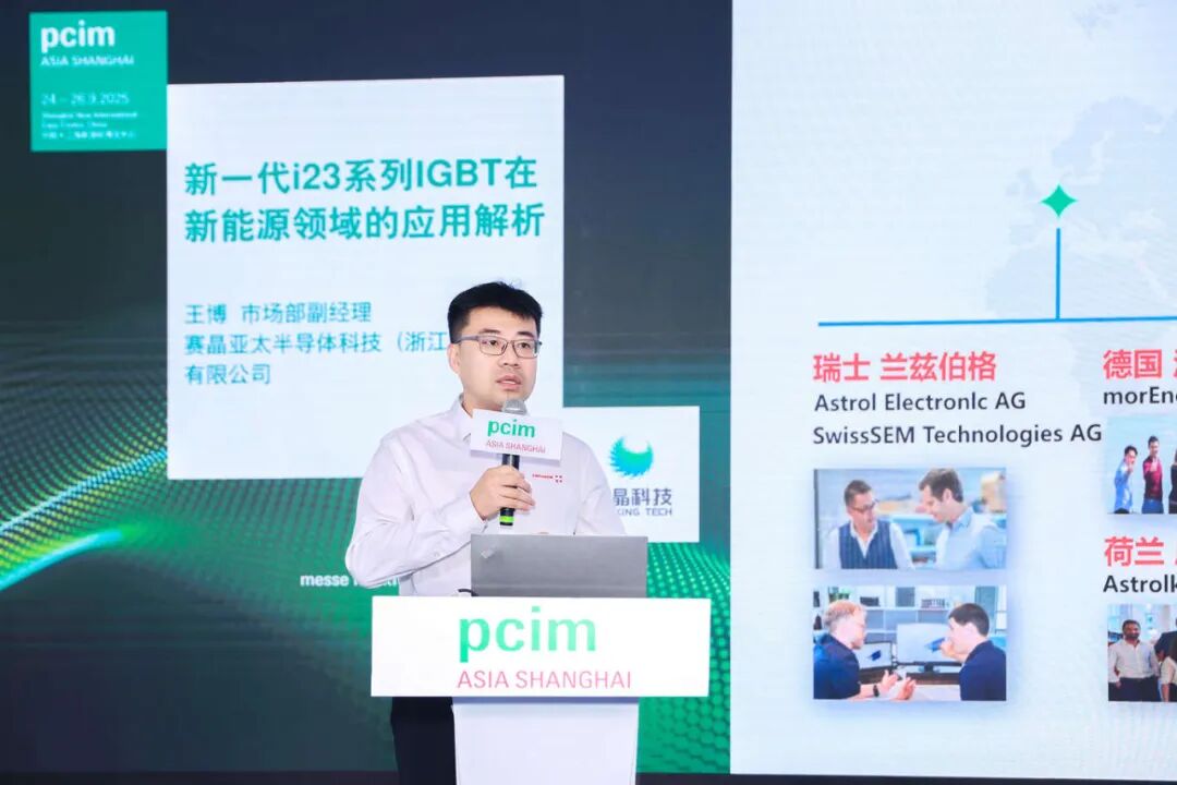 展会同期,赛晶半导体市场部副经理王博发表《新一代i23系列IGBT在新能源领域的应用解析》的演讲,为行业客户解读功率半导体技术趋势与应用案例。