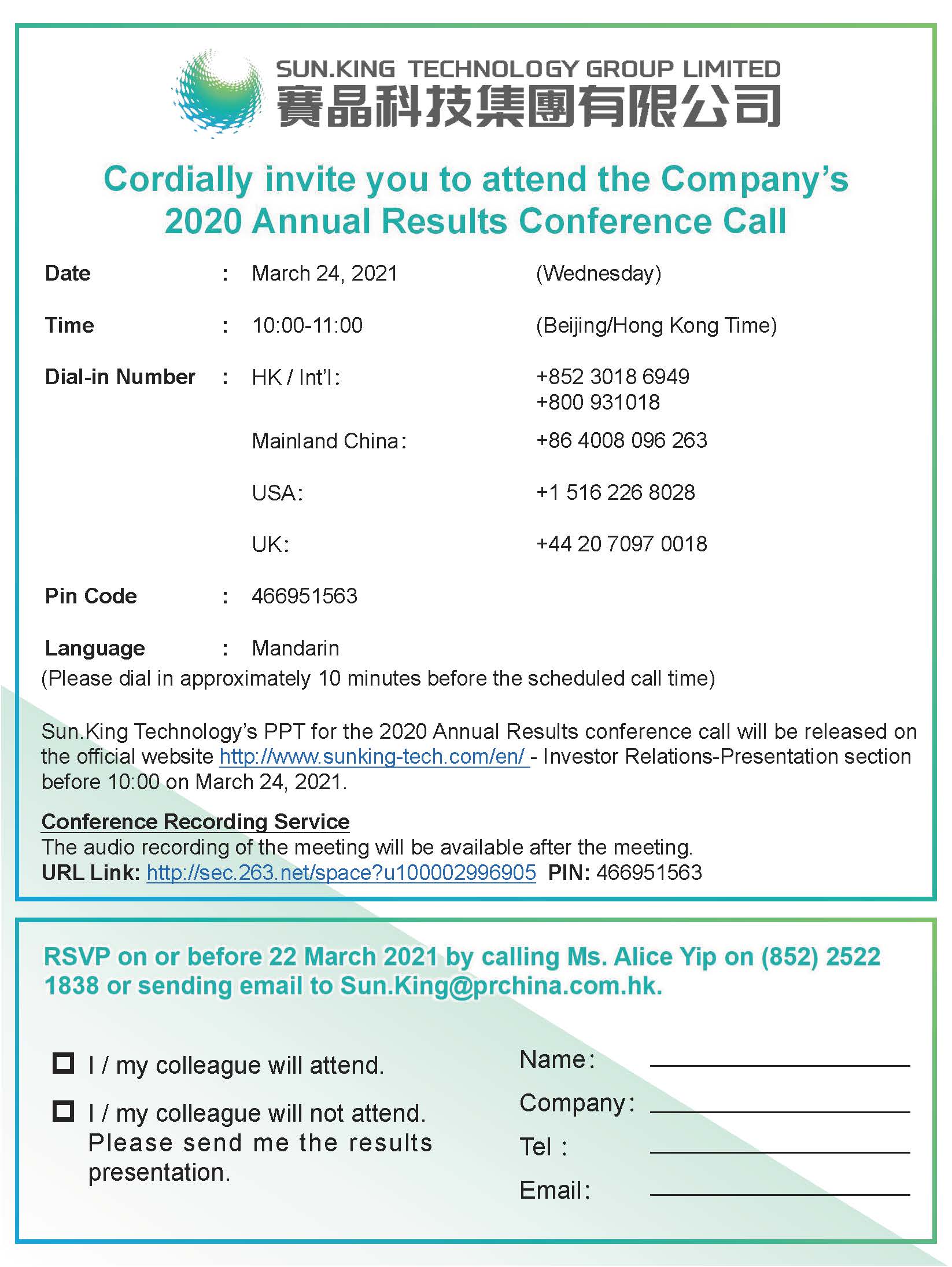 赛晶科技2020年年度业绩电话会议用PPT将于2021年2月24日10:00前,于集团官网(http://www.sunking-tech.com/)-投资者关系-推介材料板块发布。电话会会议录音回听将于会议结束后可获取。回听链接:http://sec.263.net/space?u100002996905 ,获取密码:466951563。