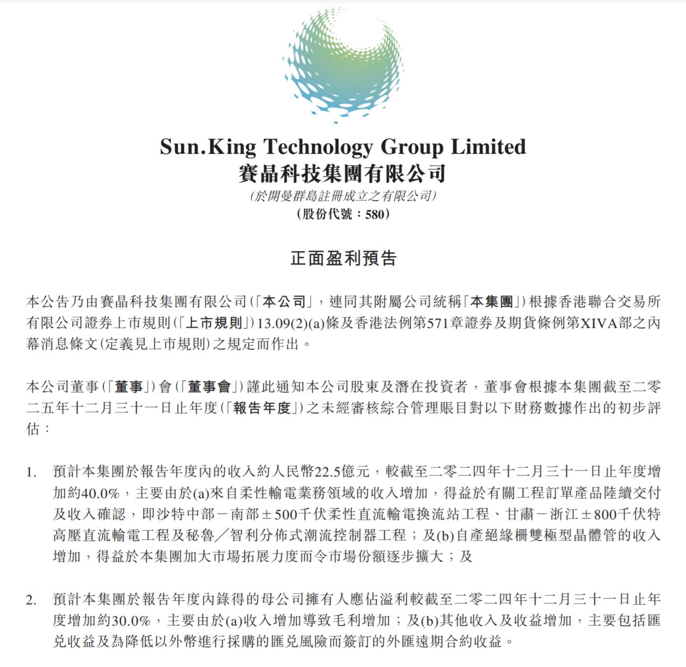 1月14日,赛晶科技发布公告:预计本集团于报告年度的收入约人民币22.5亿元,同比增长40.0%,归母净利润同比增长约30%。