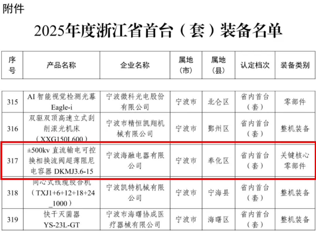 1月21日,浙江省经济和信息化厅公布了2025年浙江省首台(套)装备名单,其中赛晶科技子公司-宁波海融电器有限公司参与的“±500kv 直流输电可控换相换流阀超薄阻尼电容器 DKMJ3.6-15”成功入选,标志着该产品在实现重大技术突破、拥有自主知识产权方面获得省级权威认可,为我国直流输电核心装备国产化进程注入新动力。