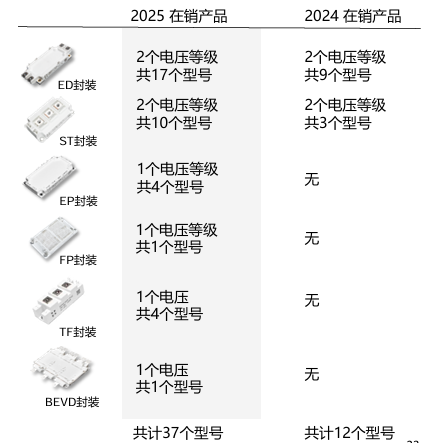 业绩与客户版图的快速扩张,核心源于产品技术的持续创新。在技术和产品创新方面,自研1200V/12mΩ、1400V/15mΩ碳化硅芯片达到国际领先水平;HEEV、EVD封装模块参数低至2mΩ至4mΩ,性能表现突出;同时推出行业稀缺的第七代微沟槽技术芯片,显著提升芯片单位面积功率,兼具成本和性能优势。2025年,陆续推出EP、FP、TF、BEVD等多款全新模块产品,并扩充ED、ST模块新型号,新产品及新型号合计贡献自研功率半导体销售收入的43%;另外国产稀缺的1700V产品同比增长295%,产品竞争力持续提升。